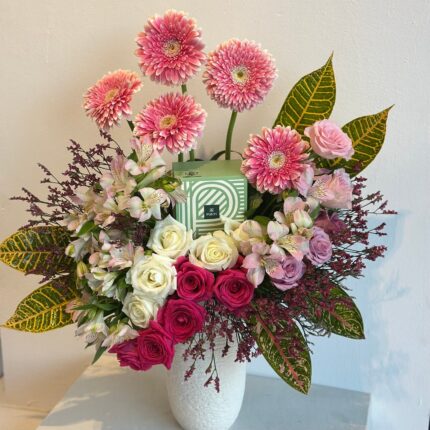 مزهريه متنوعه من ازهار الجلبيريا والجوري والبيبي روز مع ربع كيلو باتشي