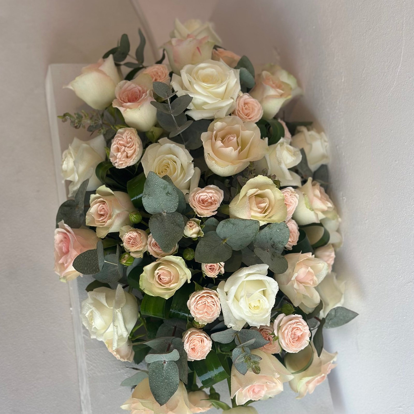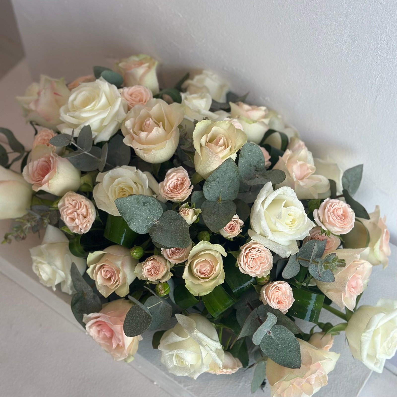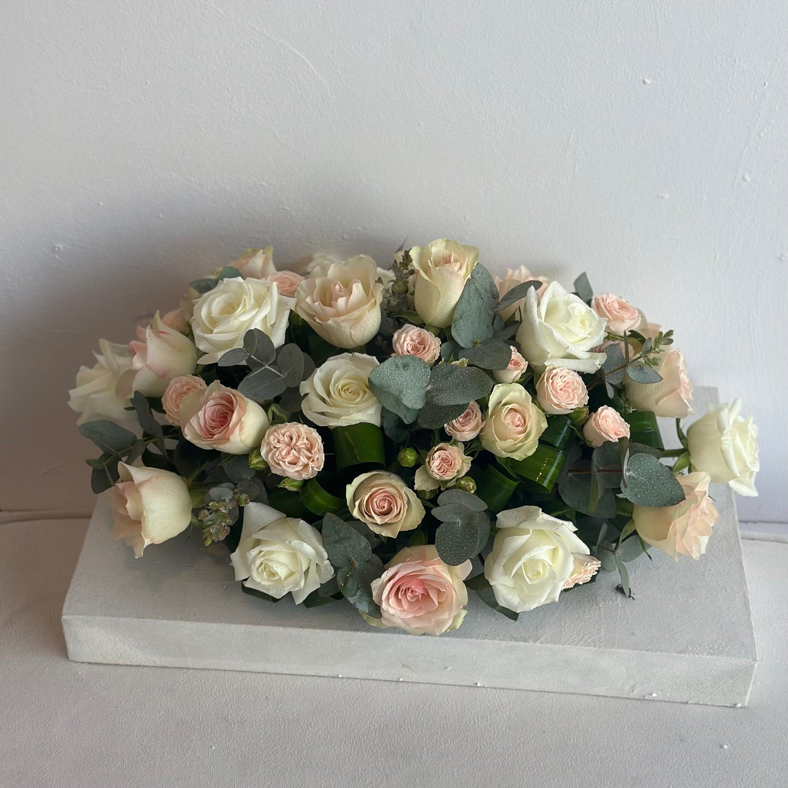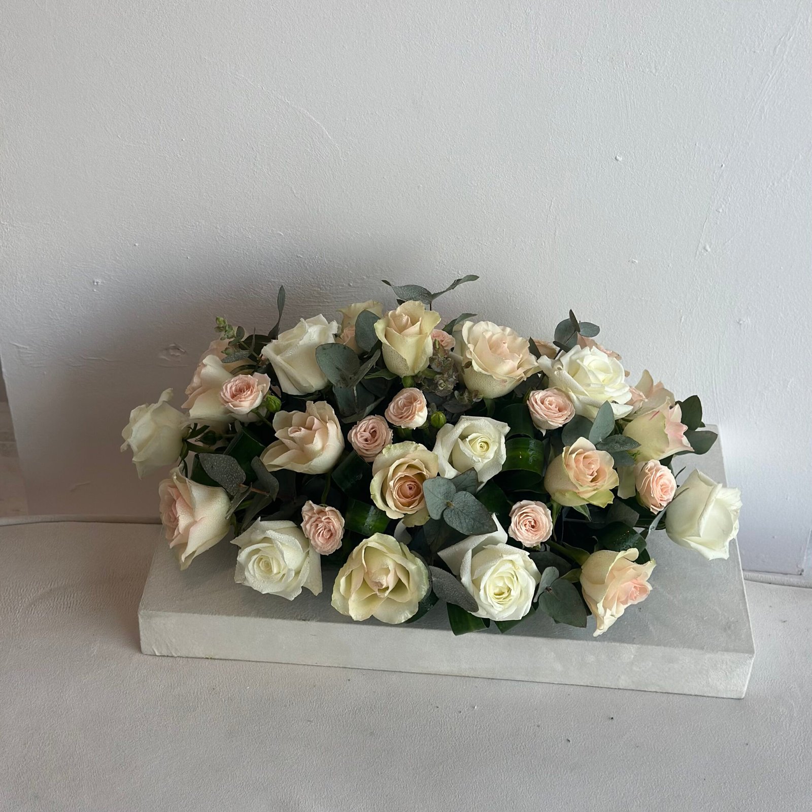 باقة طاوله مجموعه من ازهار الجوري والبيبي روز وازهار الكليبتوس بطول 45 سم وعرض 30 سم